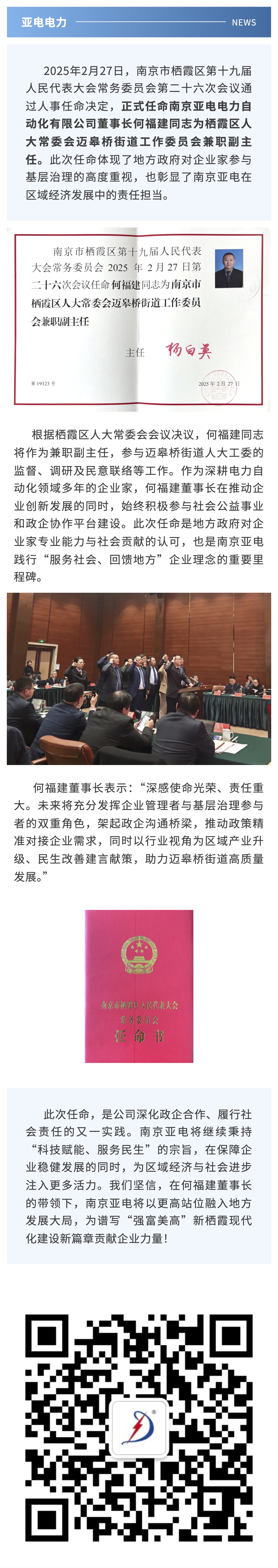何福建董事长添新职!受聘为南京市栖霞区人大常委会迈皋桥街道工委兼职副主任